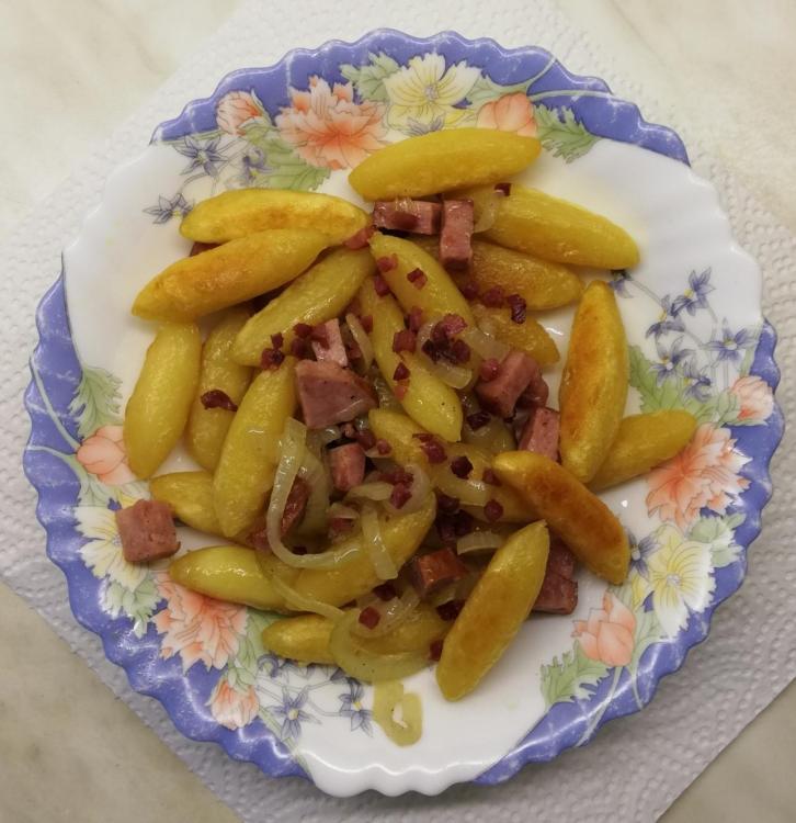16. Dzisiaj kopytka z boczusiem, kielbaską i.... cebulką Andżela trochę marudziwszy że mięsiwa nie widać, ale spróbowała i smakowało