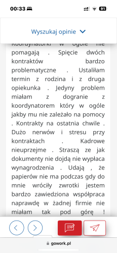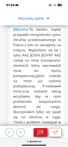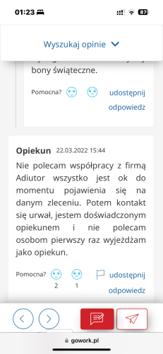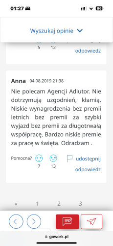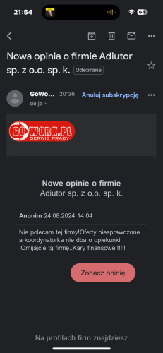 No ja dostałam pismo z adiutara zastraszające 😻żeby usunąć opinie. Na go Work firma zablokowała możliwość podpisania się PiS opinia w której najpierw opisałam pierwszą złą sytuację z tą firmą jaką miałam w zeszłym roku . Pracowałam tam u jednej osoby 4,5 miesiąca i dostałam referencje i zgodę na powrót . Miałam jednak podwyżkę ze zwzgledu że pracowałam ciągiem 4 miesiące i firma dała mi 200 euro więcej niż innym . Naturalnie rodzina niezbyt z tego faktu była zadowolona że co miesiąc płaci 200 euro .juz wtedy kiedy się dogadali obcięto mi 50 euro ze świąt a koleżanka która była przede mną otrzymała 50 euro mniej z wypłaty była wesciekla . Dowiedziala się że rzekomo wpłynęła skarga i nie mogła tego wyjaśnić z firmą ponieważ nikt nie odbierał telefonów . Ja zrobiłam wtedy dym 💨 i zaczęłam wypytywać o co chodzi . Mi wypłacono wtedy całość . Miałam tam wrócić i pojechałam z inną firmą na miesiąc jednak dziwne działanie koordynatorki doprowadziło do tego że mimo moich zapytań i zadań wysłania dokumentów potwierdzających że jestem zaakceptowania na powrót nic takiego się nie zadziało . Otrzymywałam info że ona ma czas bo teraz zajmuje się czymś innym bo ma inne zlecenia . W tym czasie współpracowałam z panią szyk z innej firmy i ona również proponowała mimorzedluzebie kontraktu na zleceniu którym byłam . Ponieważ w adniutorze byłam 5 miesięcy i chciałam tam wrócić nie zgodziłam się czekając na info o przewozie tutaj jednak Adiutor mnie wystawił i tydzień przed przejazdem oświadczył że nieaktualne . ⚠️ wiedzieli że cmam możliwość zostać na tamtej szteli bo nawet dałam panią Paulinę i panią Katarzynę razem żeby ustaliły gdzie zostaje w konsekwencji kelepectea firmy Adiutor zostałam na lodzie . I później firma na formul oświadczyła że mieli skargę na mnie ! Naprawdę ? Czyli przez 1 miesiąc nie mieli skargi ( kiedy byłam u pani szyk ) na zleceniu i później miałam przejechać i w połowie miesiąca czekałam na umowę ? A nagle tydzień przed dostali skargę ? A ja miałam referencje ! Tak właśnie działa Adiutor . Tak opisali to na stronie blokując mi możliwość opisania mojej wersji ? Później jeszcze pojechałam raz z nimi i przedłużyłam umowę kolejny raz . Najgorszy jest fakt że ostatnim razem zawieźli mnie do wisbaden do p. George’a który lubi macać kobiety . No ja nie jestem typem że zostawię sprawę sama sobie . Nie mogłam sobie z tym panem poradzić więc dzwoniłam do firmy . Przed wyjazdem zaskoczył mnie fakt że byl probkem z kontaktem z opiekunką a po przyjeździe na miejscu kobieta się zawinęła i witał mnie koordynator . Dużo dziwnych rzeczy . Ogólny chaos na tym zleceniu . Kiedy zglosilam Problem firmie - to dla nich nie problem . Zgłosiłam więc problem rodzinie . Więc mnie oni zadzwonili do firmy że się nie nadaje i że chcą mnie zwolnić . Firma się nie zgodziła ! Więc oni zmienili firmie taką wersję przedstawił mi pan z adiutora . Wiecie co było potem . Zjechałam oczywiście firma rzekomo chciała mnie przewieźć na inne zlecenie nie zapłaciła za dodatkowy nadbagaż firmie Complex która jest totalną porażką jeśli chodzi o firmę przewozową ! Ponieważ poczytajcie opinie ja jeździłam z dniami dwa razy i raz jechałam przez Luxemburg zamiast 4 h do celu jechałam dwa razy tyle a drugim razem wysadzili mnie bo afera zaczęła się o to że w niedzielę nie otrzymali wpłaty za dodatkowy kufer i powiedzieli że mnie nie zabiorą . Klient sie dla nich nie liczy tylko kasa i zdzierstwo . Afera zrobiła się o braku pieniędzy . Nie zaproponowali mi że podjedziemy moze do bankomatu 🤔 im zapłacę czy coś nie nią masz kasy na walizkę to wyp … ! Jednym słowem nie ma jazdy . A później pogrywali od adwokatów . W *wulgaryzm* im się poprzewracało . Bierzcie od nich rachunki i każde naliczenie do skarbówki ! jeśli chodzi o te małe kradzieże to mówię co dalej firma nie dość że nie zwróciła mi pieniędzy za przejazd który musiałam sama pokryć - oczywiście pismo poszło do skarbówki . Oraz nie wypłaciła mi 200 euro nie podając przyczyny mimo prośby . Z tego co wiem Adiutor jest dość słabym z obcinania kasy osobiście słyszałam od 3 osób dziś jestem kolejną ofiarą jego cięć a na forum przeczytałam od kolejnej osoby o tym procederze . Niestety sądzę że może być więcej takich osób gdyż zastraszają osoby . I blokują opisy na go Work Dużo negatywnych opinii Tak jak widzicie Adiutor na sttonid blokuje opinie które mu nie sprzyjają . Ja chciałam się odnieść do swojej opinii którą oni skomentowali że niby była skarga na mnie chciałam napisać to co wyżej napisałam jaka skarga jak ja dostałam referencje i niestety nie mogłam tego napisać 😻dodatkowo dostałam pismo do domu od prawnika oczywiście a tak że nie otrzymałam wyjaśnienia kontretnego dlaczego obcięto mi 200 euro tylko taki ogólny opis Chciałabym się bardzo dowiedzieć jakie moje zachowanie było nietaktowne ponieważ ja znam inną wersję i tak właśnie to jest że firmy ciągle pracuje bardzo dużo mam sporo referencji praktycznie z każdej szteli i nagle ktoś idzie do prawnika i serio ? 😳 dlatego postanowiłam to ponownie opublikować ponieważ tutaj przedstawiam wszystko co już jest w sieci a także rzekomo inną stronę . Jak jesteśmy też bezsilni jeśli chodzi o nasze wynagrodzenia Ponieważ zaczęłam się pluć że nie przyszły pieniądze dostałam tą informację nie ma jednak określonego tam konkretnego punktu co autor miał na myśli Ja osobiście nie polecam tą firmę i nie uważam że w tym momencie nie wpływa szczególnie na zatrudnienie gdyż jest to moje osobiste przeżycie ! I można się spierać niestety jeśli byłam złą opiekunką jak w piśmie zaznaczył prawnik 🧑💼 „ moje zachowanie „ spowodowało rozwiązanie umowy a ni