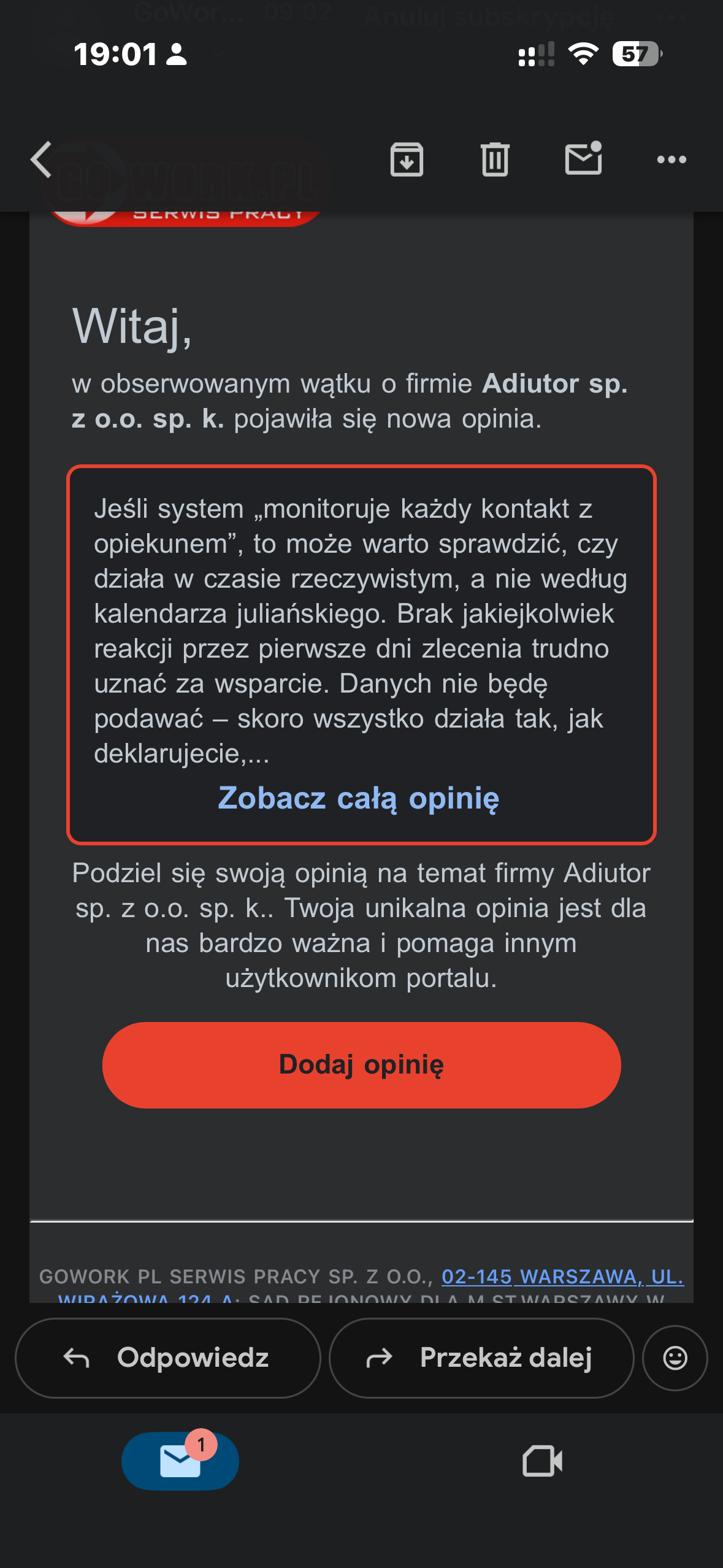 Źle zrozumiałaś intencje zwrocilam opinie na adiu.. ktory bardzo szybko usuwa negatywne opinie ja zrobiłam subskrypcje to wiem . Np z go Work zaraz po pojawieniu sie negatywnej opinii ona natychmiast znika i pojawia sie 5 pozytywnych robionych naprawdopodobniej przez pracowników którzy tak jak tu monitoruja treści i wtsylaja pisma zagradzające do opiekunek 😂tych hegatywbych pewnie już nie ma a po negatywnej wysyp pozytywnych -