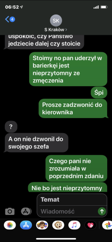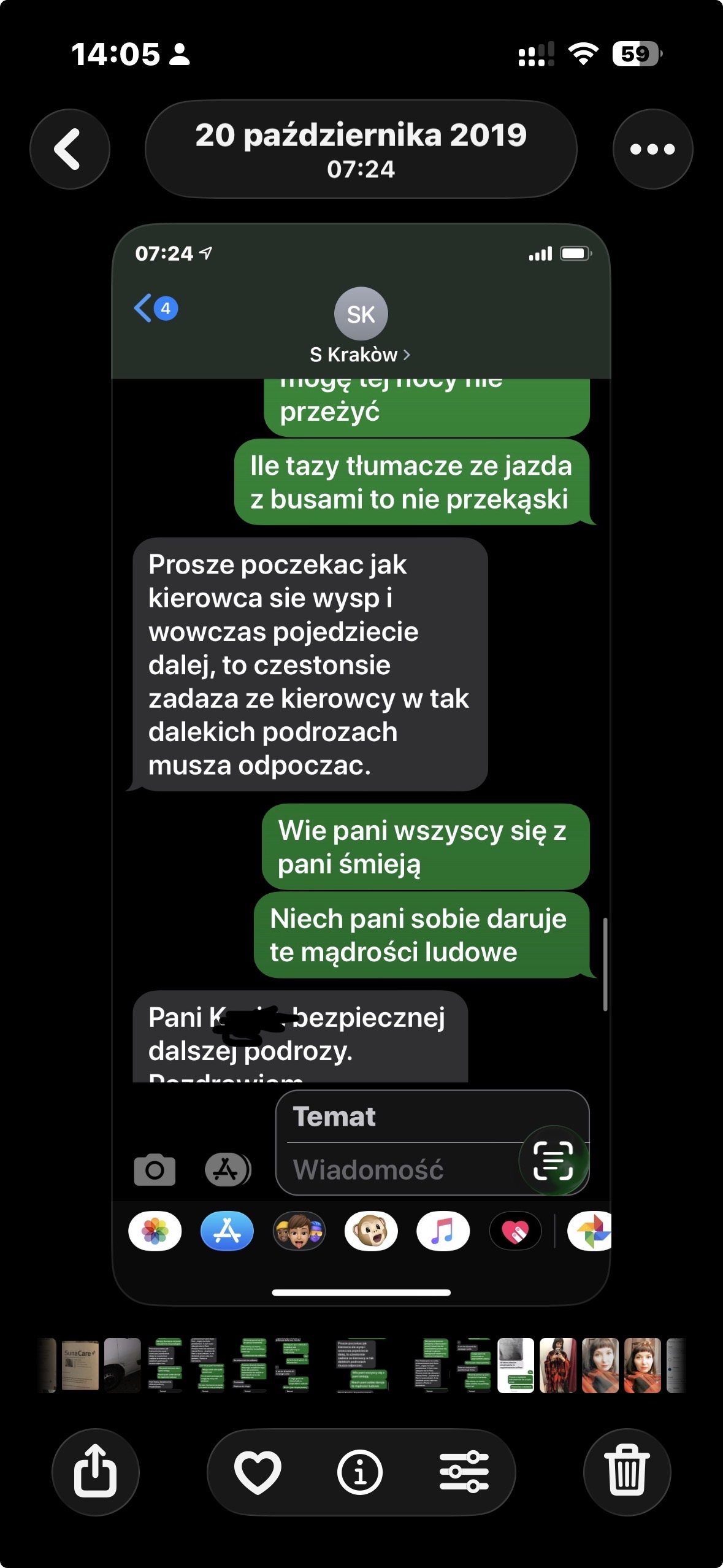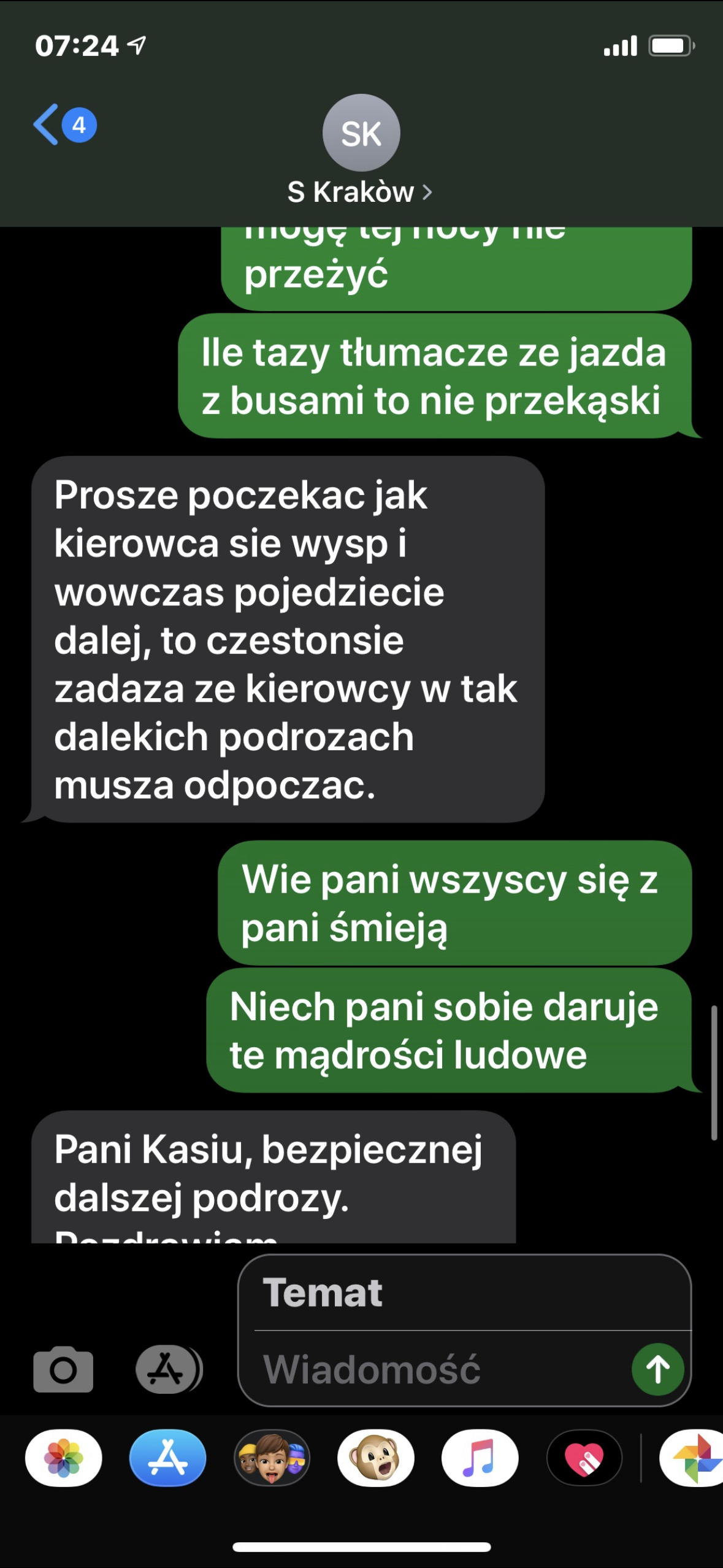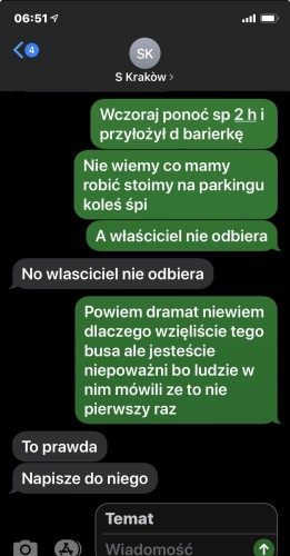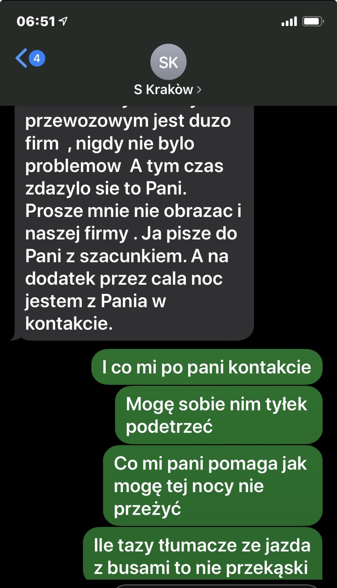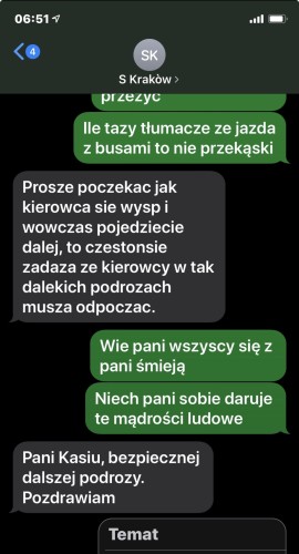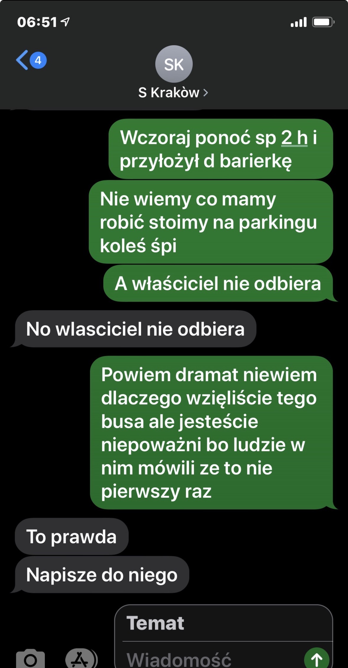 Znalazłam SMS-y z pena agencja niestety nie namiętna nazwy ale w drodze powrotnej byś spóźnił się 5 h bo była to podrzędna firma . Wtedy jeszcze nie wiedziałam że mogę dyskutować na temat firm przewozowych . Dziś jeśli firma nie zamówi mi busa tego co chce bo chce przyoszczędzić 20 euro to po prostu nie wsiadam . Poniżej korespondencja z firmą w razie wypadku i ich odpowiedz Ciężka to była rozmowa z tą firmą pamiętam że nawet ta osoba nie odebrała . Kierowca stuknął w barierki bo zasnął i zjechał na parking . Po przyjeździe oczywiście też zero zainteresowania . Wina była ewidentna firmy transportowej która kazała kierowcy jechać po jakiegoś klienta . Dlatego ja szanuję firmy np Gtv gdzie są przestrzegane regulaminy pracy dla kierowców i ich bezpieczeństwo. Naprawdę czasem warto dołożyć te parę złoty i nie narażać się na niebezpieczeństwo . ⚠️ -