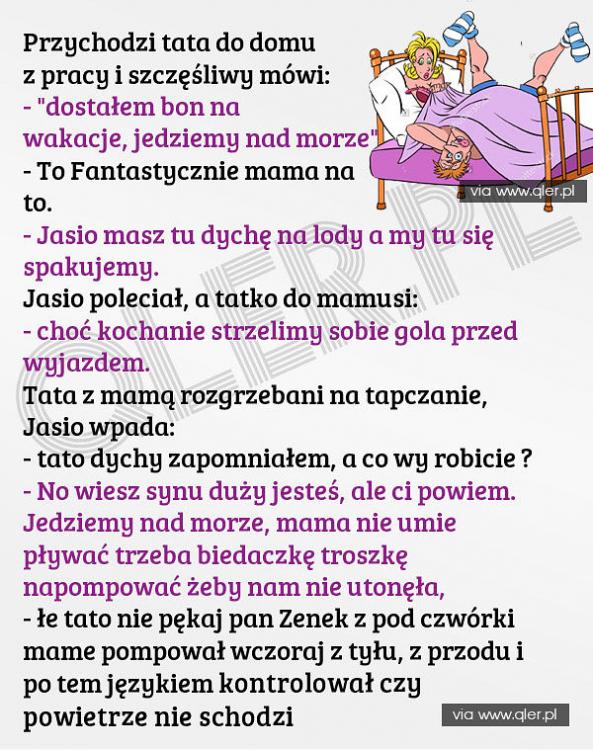 Przychodzi facet do pracy pobity, podrapany itd. Kumpel go pyta: - Kto ci to zrobił ? - Żona... - Żona? Za co !? - Powiedziałem do niej "ty". - I za to cię pobiła? A jak dokładnie powiedziałeś ? - Ona mówi do mnie "już się nie kochaliśmy ze dwa lata..." A ja do niej: - Chyba ty... Adasiu trzeba sie posmiac nie wiem jak tam u was ale u mnie pogoda tragedja i to ja juz chyba portzebuje pomocy hahhahahhah:) Facetowi żona zaczęła mówić przez sen. Jakieś jęki i imię Rysiek... Bez dwóch zdań doprawiała mu rogi i facet szybko doszedł do takiego samego wniosku. Aby to sprawdzić, pewnego dnia udał, że wychodzi do pracy i schował się w szafie. Patrzy, a tu żona idzie pod prysznic, układa sobie włosy, maluje się, perfumuje i w samej koszulce nocnej wraca do łóżka. W tym momencie otwierają się drzwi i wchodzi Rysiek... Super przystojny, wysoki, śniada cera, czarne, bujne włosy - jednym słowem bóstwo. Facet w szafie myśli: "Muszę przyznać, że ten Rysiek to ma klasę!". Rysiek zdejmuje powoli koszulę i spodnie, a na nim stylowe ciuchy, najmodniejsze i najdroższe w tym sezonie. Facet w szafie myśli: "szlag, ale ten Rysiek, to jednak jest zajebisty!". Rysiek kończy się rozbierać od pasa w górę, a tu na brzuchu mięśnie krateczka-kaloryfer, wysportowany, a klatka jak u gladiatora. Facet w szafie myśli: "ten Rysiek, to ekstra gość!". Rysiek zdejmuje super-trendy bokserki, a tu penis cudowny - pierwsza klasa. Facet w szafie myśli: "O żesz ty, Rysiek jest rewelacyjny" W tym momencie żona zdejmuje koszulę nocną i pojawia się ciało z cellulitisem, obwisłe piersi, rozstępy... Facet w szafie myśli: "Ja pier....lę! Ale wstyd przed Ryśkiem". Para w łóżku: - To twoje piersi, czy gęsia skorka? - A ty się kochałeś, czy trząsłeś z zimna? xxxxxxxxxxxx Teraz troche ostrzej Dwie gospodynie stoją przy pralce: - Jadźka, ale tak między nami... anal już próbowałaś? - Nieee, zadowolona jestem z Dosi...