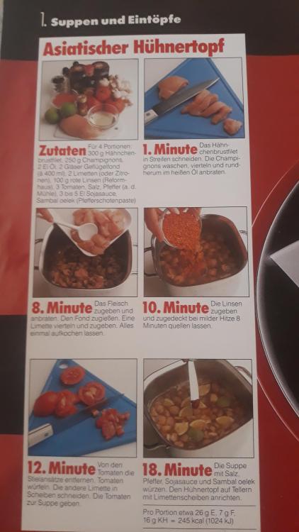 22. ASIATISCHER HÜHNERTOPF-245 kcal Ungewöhntlich exotisch, gut: Hünhertopf mit roten Linsen, Tomaten, Champignons inf Limetten, verfeinert mit Sojasauce inf Sambal oelek.