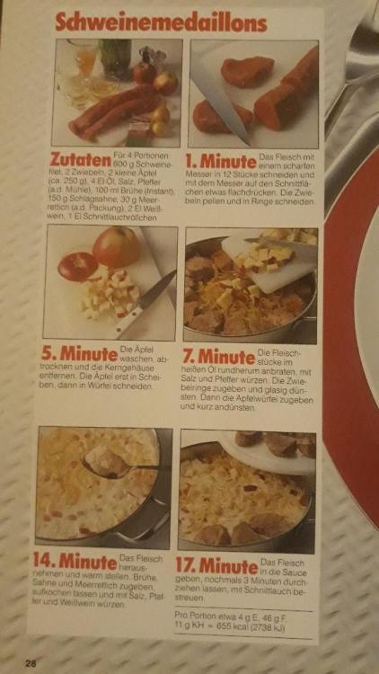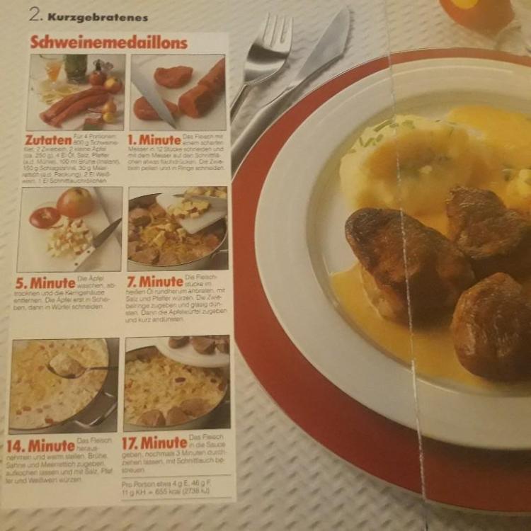 20. SCHWEINEMEDALIONS-625 KCAL Zu den Schweinemedalions mit süß-scharfer Apfel-Meerretich-Sauce schmeckt Karyifelpürre aus der Packung, das zubereitet Word, während die Sauce kocht.