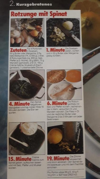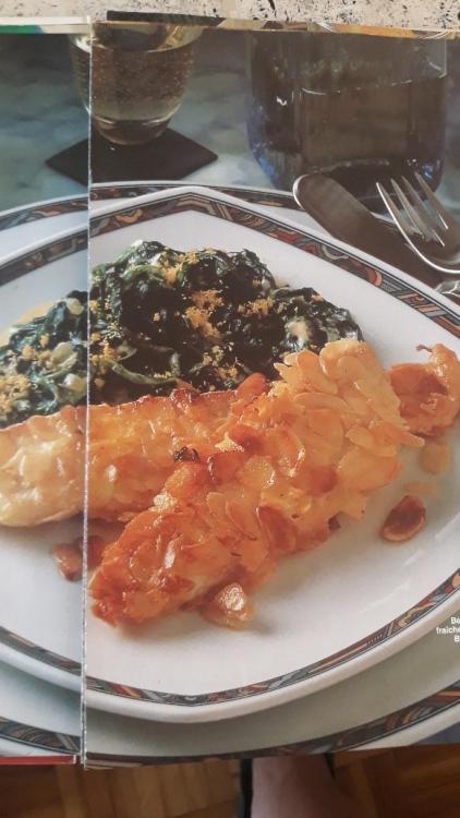 9. Die Rotzungenfilets werden in einer Hülle aus Mehl. Ei und Mandeln goldbraun gebraten. Beilage: mit Creme fraiche verfeinerter Blattspinat.