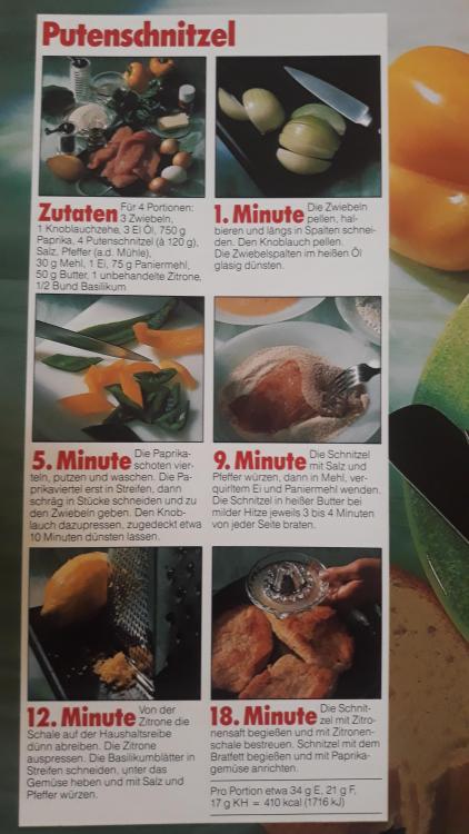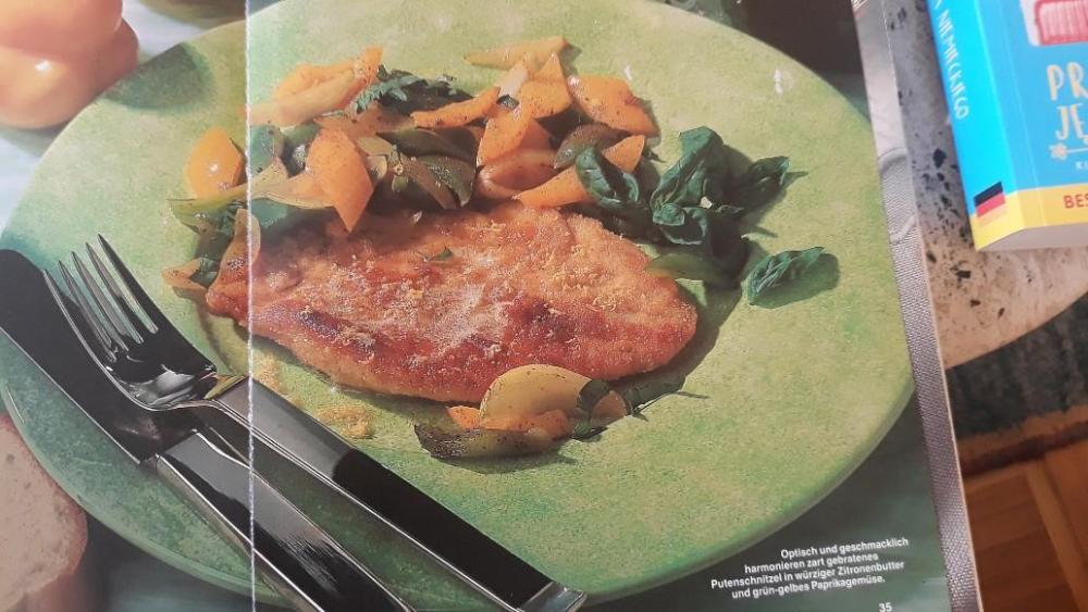 8. Optisch inf geschmacklich harmonieren zart gebratene Putenschnitzel in würziger Zitronenbutter und grün-gelbes Paprikagemüse