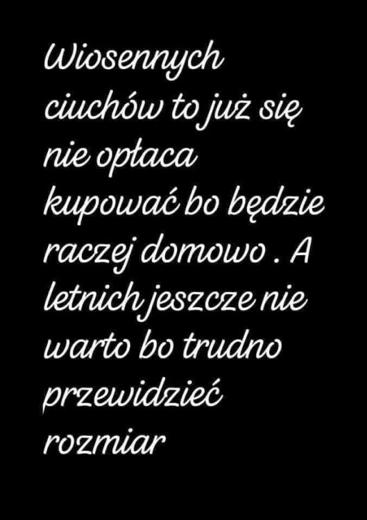21. Dobry wieczór , lub dzień dobry Ludki Czas mi się całkowicie przestawił w tej nowej rzeczywistości . Wczoraj , czy przedwczoraj ( gubię się w czasie ) bawiłam się w perfekcyjną panią domu . Wyszorowałam wszystko to , co powinno być wyszorowane , a nawet to , czego nie powinnam ruszać Dzisiaj wisiałam na telefonie z innymi wyalienowanymi ludkami . Rozmowy widocznie były bardzo wyczerpujące , bo przespałam większość dnia Teraz przeglądam gadki pisane , a drugim okiem spoglądam na telewizor . Trzymajcie się dzielnie i niech poczucie humoru Was nie opuszcza , bo świat się nie kończy , tylko chwilowo jest do dopy.