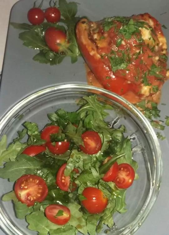 13. Mała zmiana nastąpiła w trakcie, dodałam sosu holenderskiego, a jako zielenina, rukola z olejem rydzowym, syropem z granatów i pomidorkami z ogródka szefowej. A i paprykę przykryłam serem.