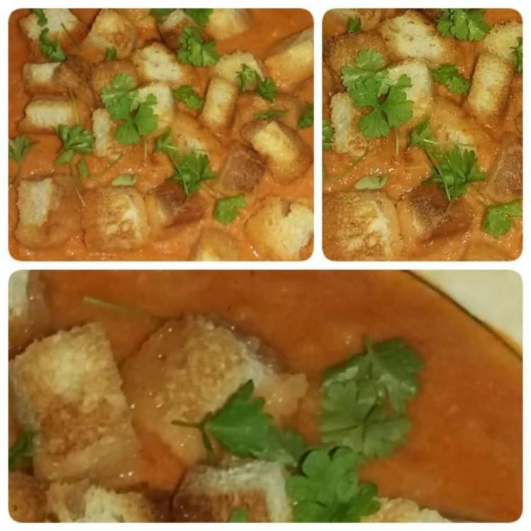 19. Zupa pomidorowa ,zagęszczona zmiksowanym mięsem z kurczaka , grzanki.