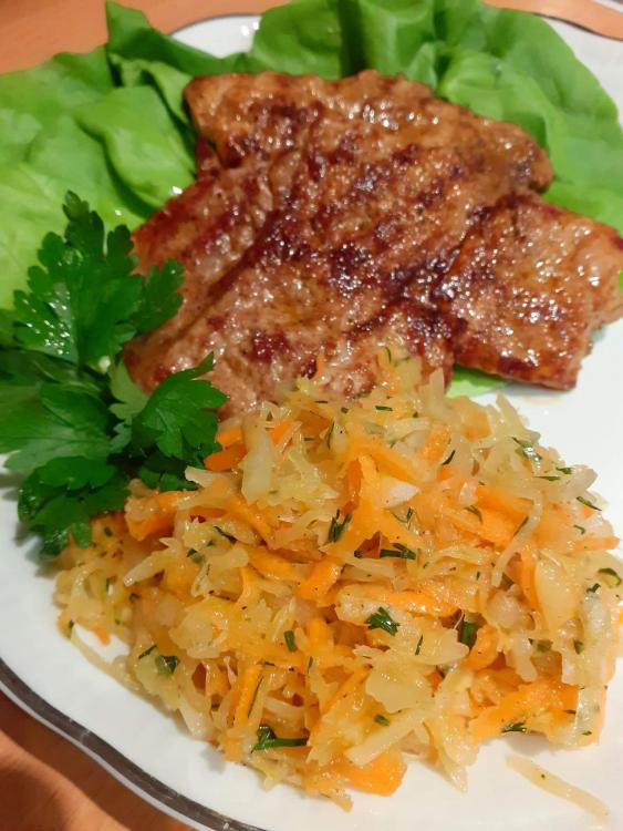 9. Wątróbka z kurczaka z cebulą i jabłkiem, surówka z kiszonej kapusty, ziemniaki.