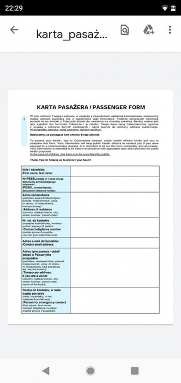 To jest formularz, ktory podobno trzeba wypełnić na granicy RP. Napisałam do TVN maila, bo to ewidentne wyłudzanie danych osobowych, chronionych przez RODO. Mam na mysli nr Pesel i nr dowodu. Ciekawe czy mi odpowiedzą. Do UODO tez dzwoniłam, ale czynne do 14 00. Zadzwonię zatem jutro. -