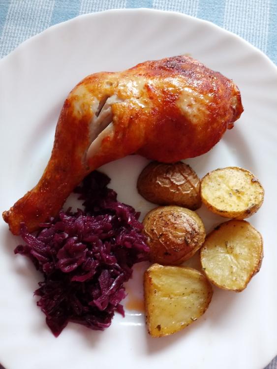 8. Udko pieczone z ćwiartkami ziemniaków i resztka kapusty czerwonej.