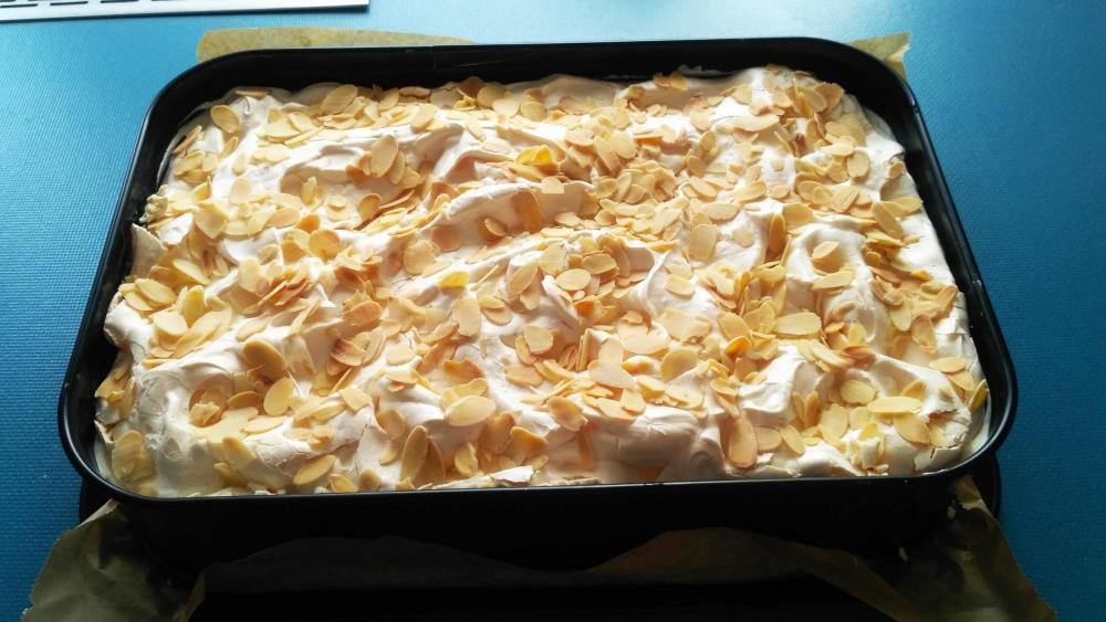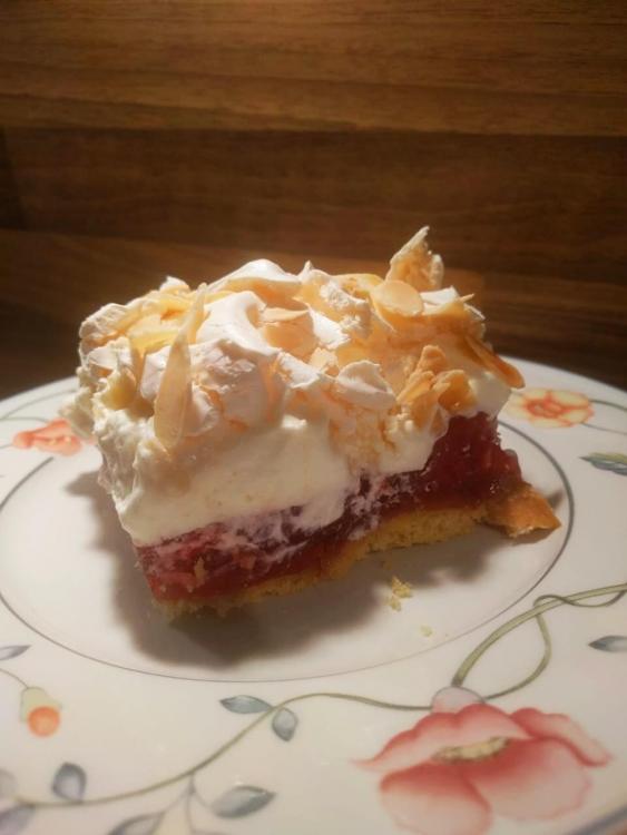 Obiecana malinowa chmurka Nie wiem, jaka pomroczność mnie wczoraj ogarnęła, że nie wrzuciłam linka do przepisu, ciasto robię wg tego: https://www.mojewypieki.com/przepis/malinowa-chmurka Bezę i kruche robię dzień wcześniej (tak, jak radzi autorka bloga), malinową galaretkę przywożę z Polski lub używam galaretki o innym smaku kupionej w De (na malinową nigdy nie trafiłam), krem robię ze śmietany 30% (36% w De nie znalazłam) i dodaję trochę żelatyny (Sofort Gelatine) lub Sahnesteif. Ciasto jest przepyszne, bardziej jak deser niż typowy placek, jutro będę przepis tłumaczyć na niemiecki, bo nie tylko mi smakuje . Trochę nieładnie mi się ukroiło, ale za wcześnie się do niego dobrałam .
