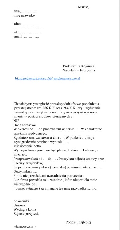 Nie otrzymałaś wynagrodzenia ? Gdzie zgłosić :)Kare opublikował(a) temat w Praca Opiekunki w Niemczech Co zrobić kiedy firma nie wypłaca ci wynagrodzenia 1. możesz iść do sądu . Często jednak są to małe środki i dużo z tym zachodu . Firmy na tym korzystają obcinając nam po 50-100 lub 200 euro . Pomyśleć tylko że wystarczy takich 10 cięć w miesiącu u jedną wypłata w kieszeni . 2. mi zdarzyło się parę razy że dostałam referencje a np. Musiałam zjechać bo wyrwałam zęba i spuchłam i firma też próbowała mi wmówić że była na mnie skarga 😂ja pytam serio skarga i referencje ? 3. dziewczyny to że firma mówi niekoniecznie musi być prawda . Pracujecie nie na medale tylko na chleb . Pracę wykonałyście i nikt nie ma prawa zabierać wam pieniędzy nie przedstawiając konkretnych uzasadnionych powodów nie wiem pijaństwo czy kradzież która powinna być udokumentowana a nie na słowo . 4. często nieróbstwo samych koordynatorów sprawia że zaprzepaszczają kontrakty a wina przed szefem obarczają nas . 😳 zacznijcie to zgłaszać do odpowiednich służb bo może się okazać że są to standardowe działania firm . Poniżej przedstawiam najprostszy wzór pisma . który można wyślą. Mailowo ! 5. Jeśli firmie zdarza się to incydentalnie sprawa zostanie umorzona jeśli to jest nagminnie może się okazać że jesteście jedną z wielu poszkodowanych osób którym cięte są wynagrodzenia im więcej osób zgłosi tym większa szansa na zwrot środków 6. nic nie płacicie za zgłoszenie . Zero adwokatów . Proces toczy się sam . Istnieje ryzyko że zostanie umorzony —————————————- Miasto, dnia,………….. Imię nazwisko adres…………… …………………….. tel.:……………… email:………….. Prokuratura Rejonwa Wrocław – Fabryczna [email protected] Chciałabym/ ym zgłosić prawdopodobieństwo popełnienia przestepstwo z art. 286 K.K oraz 284.K.K. czyli wyłudznia pieniedzy oraz oszytwa przez firmę oraz przywłaszczenia mienia w postaci srodków pienięznych : NIP Dane adresowe W okeredi od … do pracowałam w firmie …. W charakterze opiekuna medycznego. Zgodnie z umowa zawarta dnia …. W punkcie … moje wynagrodzenie powinno wynosic ….. Miesieczcnie netto. Wynagrodzenie powinno być płatne do dnia … kolejnego miesiaca. Przepracowałam od … do … . Przesyłam zdjecia umowy oraz ( scriny przejazdów) Za przepracowany okres ( ilosc dni) powinnam otrzymac …. Otrzymałam …. Firma nie przesłała mi uzasadnienia potracenia . Lub firma przesłała mi uzasadnie , które nie jest dla mnie wiarygodne bo … ( opisac sytuacje ) sa mi znane tez inne przypadki itd. Itd. Załaczniki : Umowa Wyciag z konta Zdjecie przejazdu Podpis ( najlepiej własnoreczny )